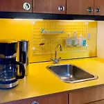 Une bouilloire électrique, un réfrigérateur et de la vaisselle peuvent être trouvés dans une cuisine équipée.